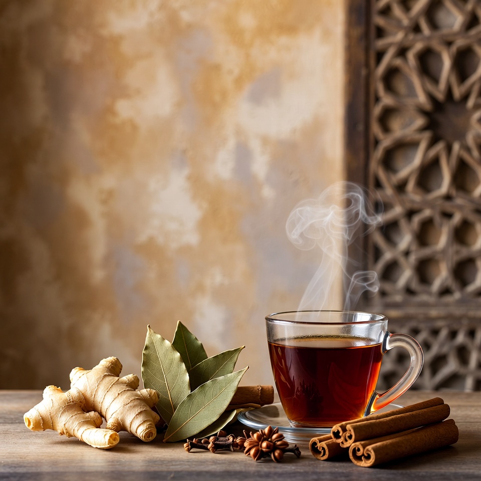 شاي الزنجبيل وورق الغار والقرفة والقرنفل: دفء يومي يدعم رفاهيتك
