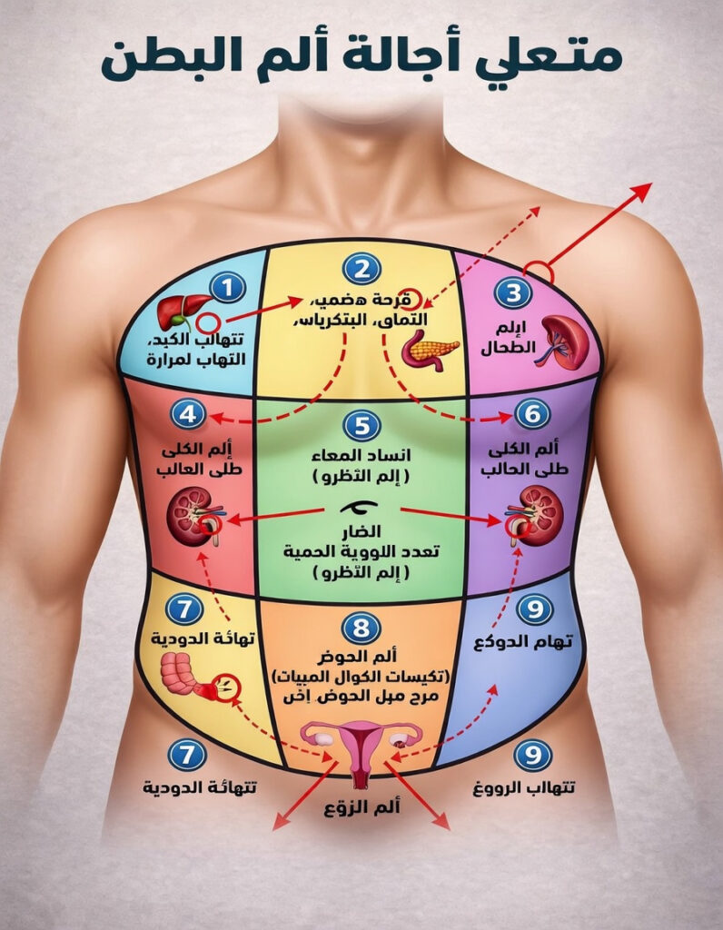 هذه المادة مقدمة لأغراض التثقيف والمعلومات العامة فقط، ولا تهدف إلى التشخيص أو العلاج أو استبدال نصيحة أخصائي رعاية صحية مؤهل. إذا كنت تعاني من ألم في البطن أو أي مشكلة صحية أخرى، فاستشر طبيبًا أو مقدم رعاية طبية مناسبًا للحصول على التقييم والرعاية اللازمين.