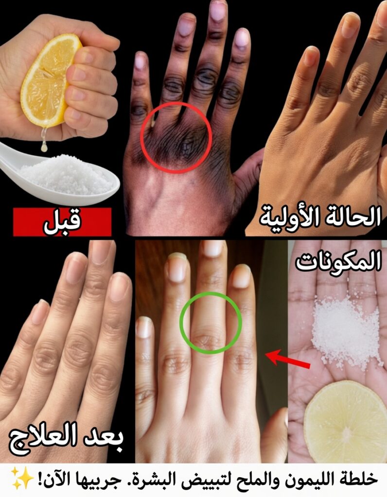 الاسمرار حول المفاصل أو آثار الشمس من أكثر ما يجعل اليدين تبدوان “أكبر” من العمر الحقيقي. في هذا الروتين، قد يساهم الليمون مع التقشير الخفيف في تقليل مظهر البقع تدريجيًا مع الاستمرار دون مبالغة.